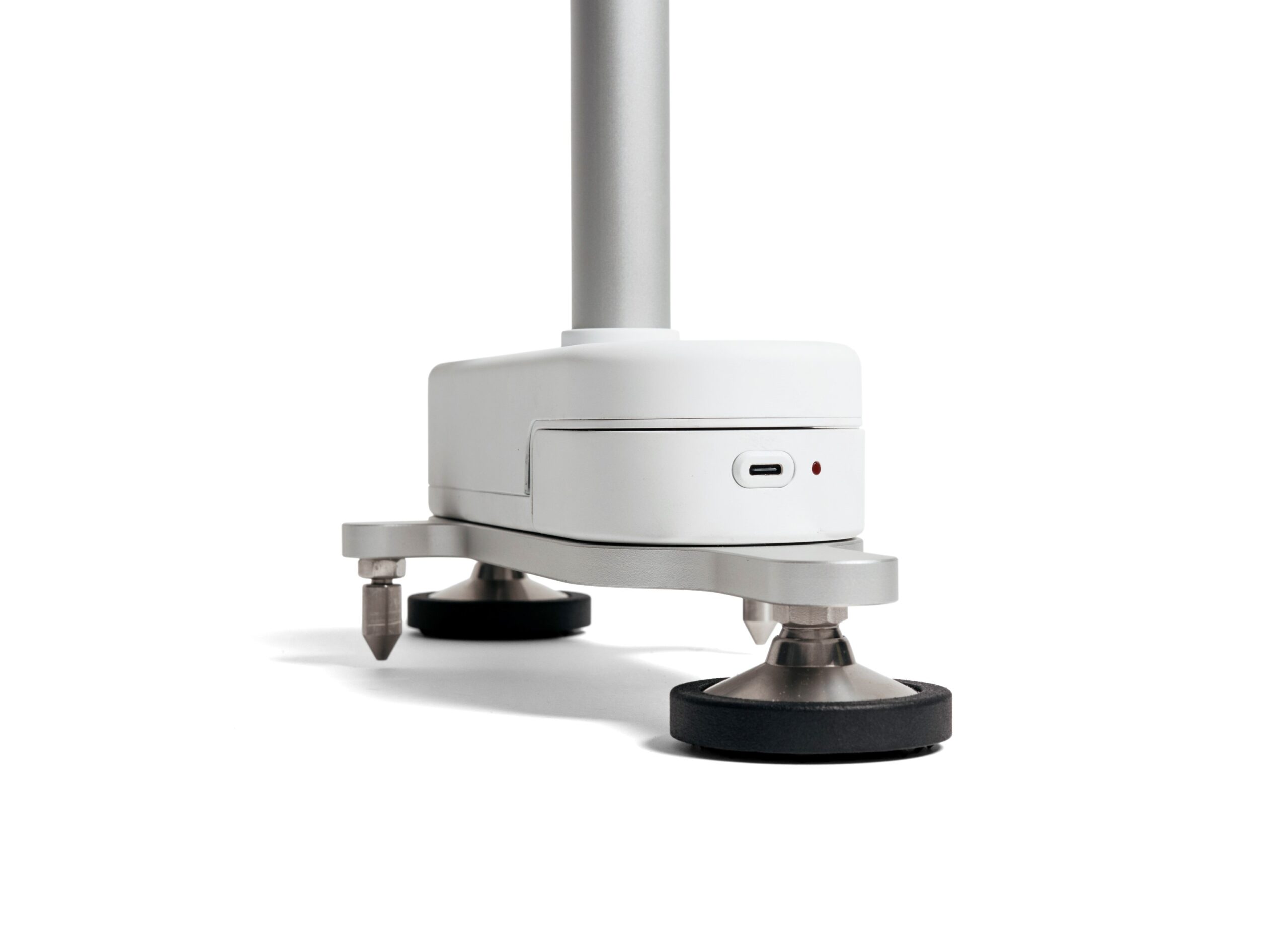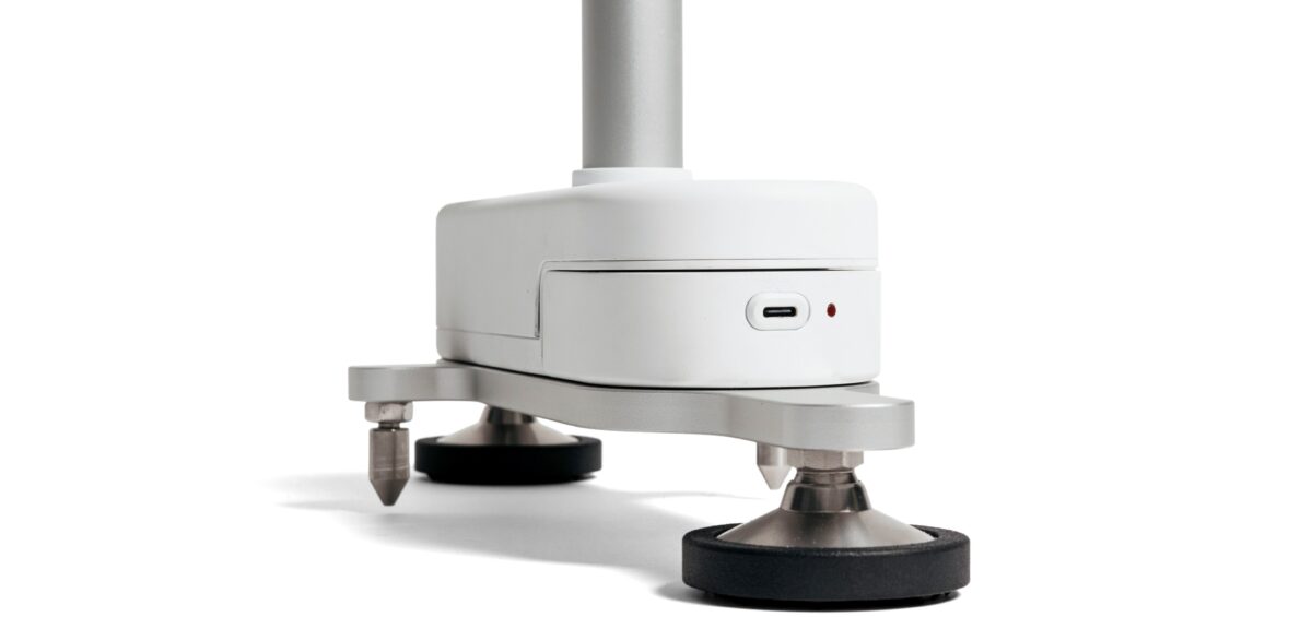 El uso de aluminio anodizado permitió obtener una estructura ligera, resistente a la corrosión y con una estética técnica que transmite rigor. La presencia de un mástil extensible, un pomo giratorio para facilitar los giros y una distribución pensada para que la posición del centro de masas no experimente oscilaciones durante el desplazamiento. El sistema LED, sencillo y visible, guía al operario sin distracciones.